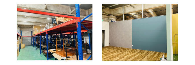新たなエリアは主に当社が扱う中古家具や新品商材の在庫置き場として、さらには新たな撮影ブースも作られました!